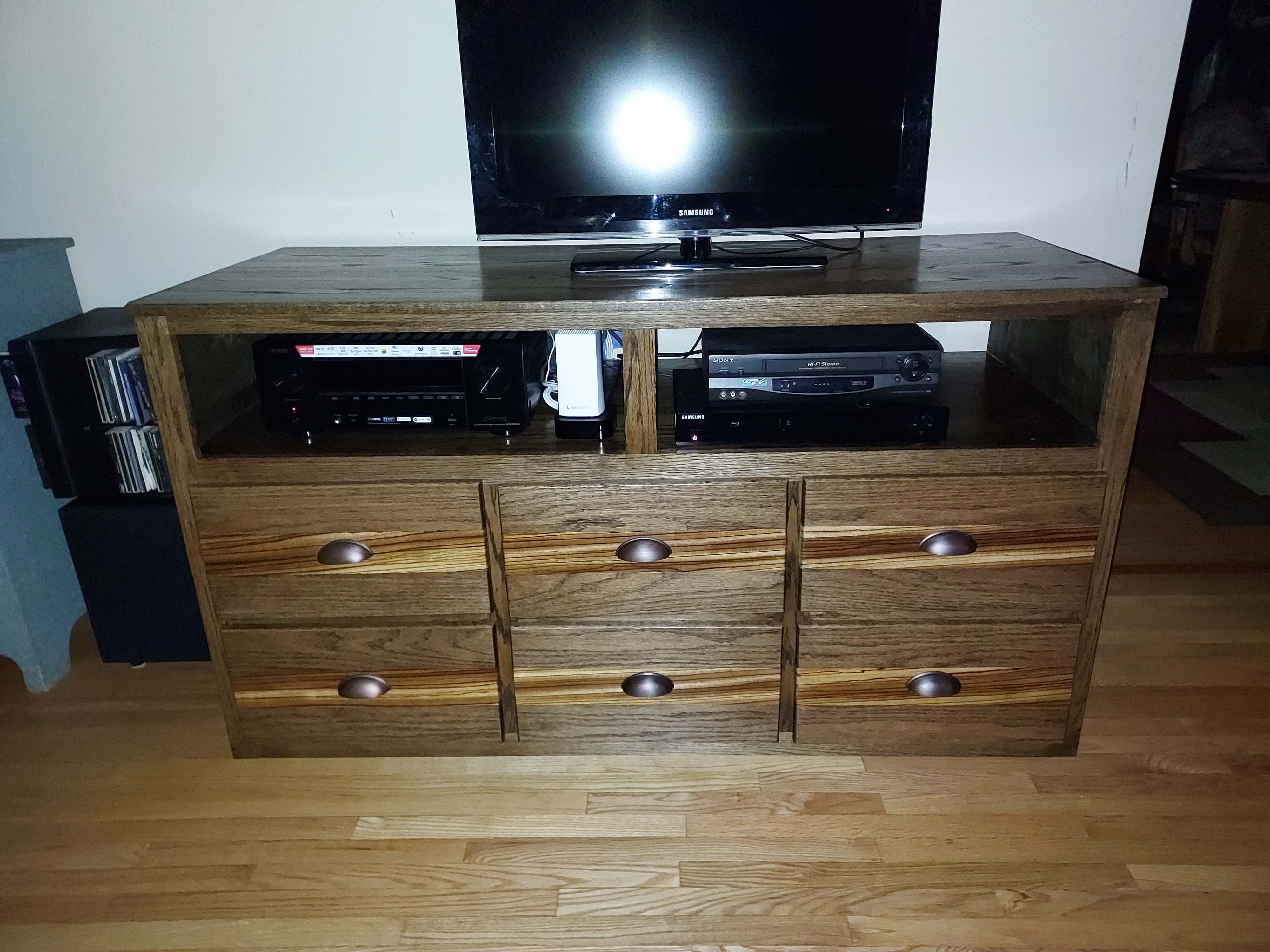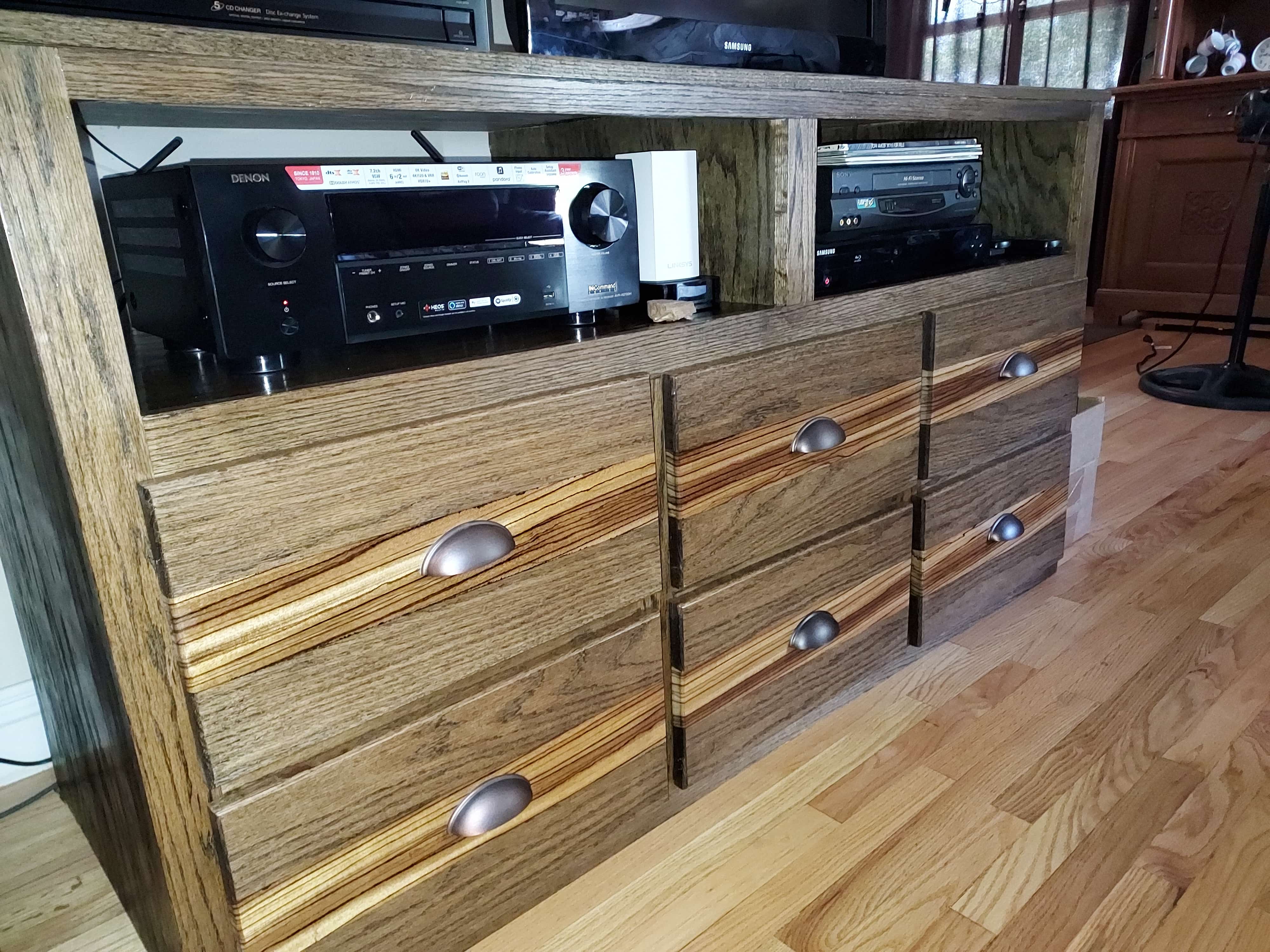 A different view of the entertainment center showing the zebra wood in the drawer fronts. |